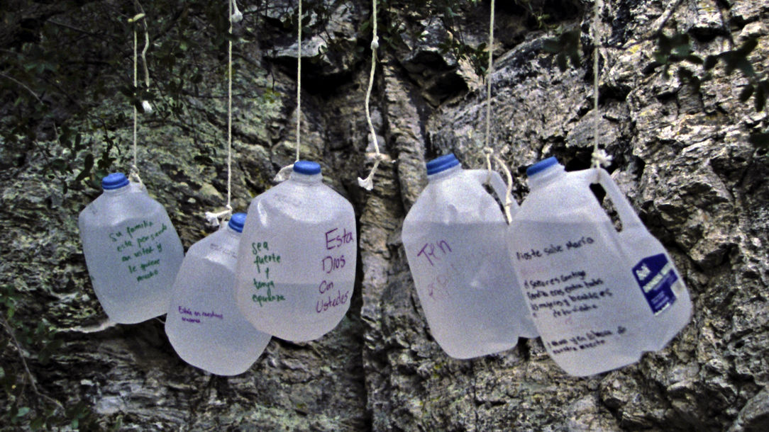 The 16mm footage deliberately overwhelms with open space, massive skies and landscapes shimmering in deathly heat. The meticulous sound design focuses on desert winds and the nocturnal sounds of venomous insects, deadly snakes and predatory mountain lions. At times, migrants’ and residents’ voiceover emerges from a completely black screen, telling of getting lost, discovering a body or taking in a shivering migrant. Other voices chillingly describe the desert in dark, psychedelic terms or invoke mythical monsters. The desert’s distortion of reality can be fatal; migrants often lose their way and wander in circles until they are picked up by border patrols or die. Captured on screen, El Mar La Mar’s building dread attempts to drive home the horror of a five-day desert crossing undertaken on foot.
