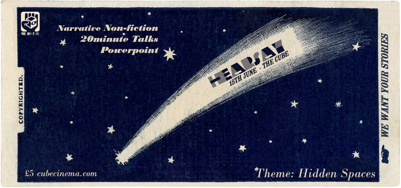 Join us on our first voyage into a night narrative nonfiction short lectures. We are looking for people who have interesting nonfiction stories to tell - be they podcasters, documentarians, journalists, comedians, theatre makers or folks who have maintained their amateur status for the Olympics. If you have a story you have been researching or a piece of history that people should know about, something odd from your own life or short doc you have made, please email hearsay@cubecinema.com.