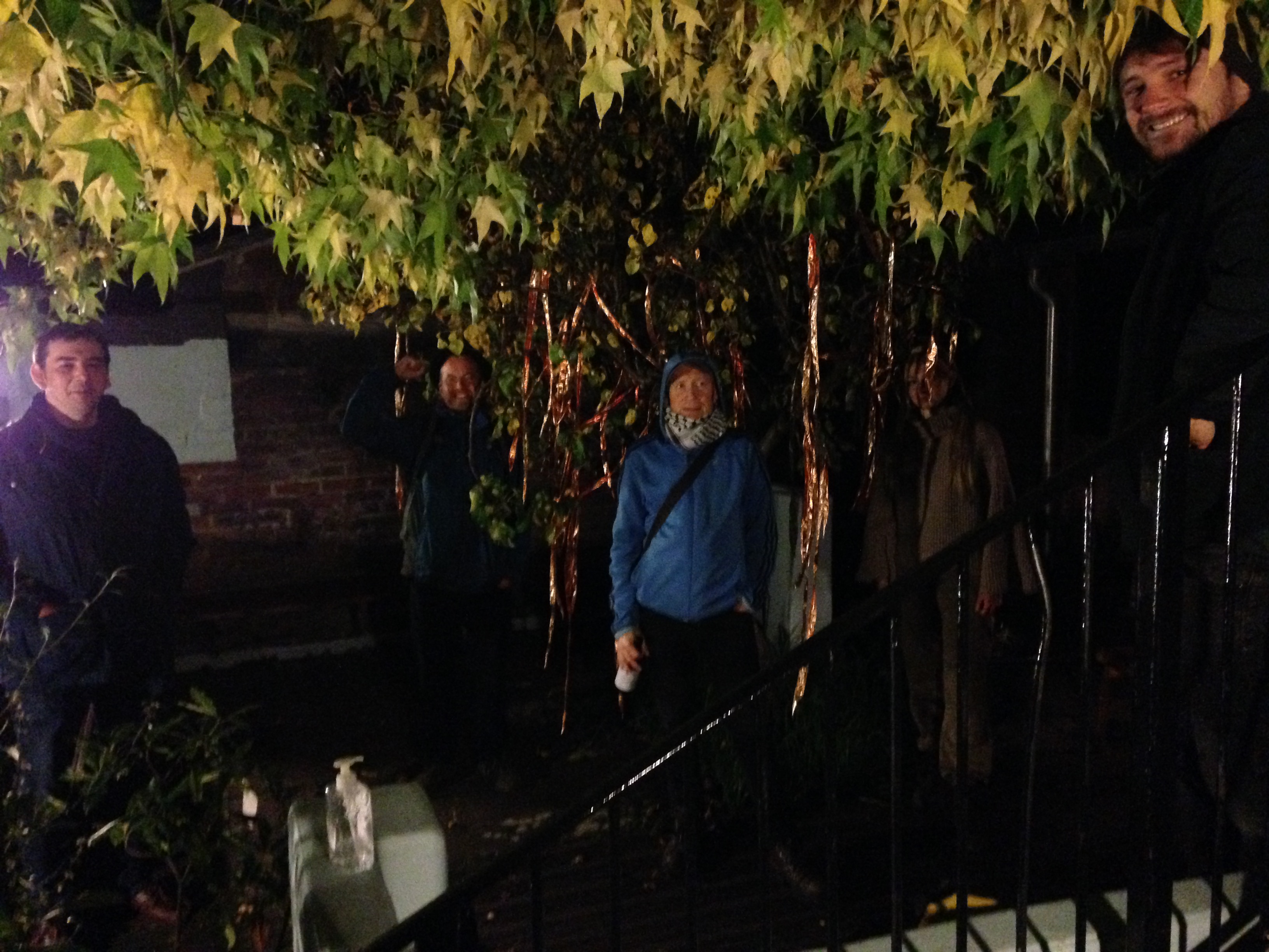 Chiz took a photo of the rest of us: from left to right – Stelios, Pete, Kevin, Hannah (well hidden by the ribboned tree!), and Alfie. We had obviously offended the ancestral spirits in some way, as most of us were transformed into flying heads or had our bodies merged into the garden’s vegetation.