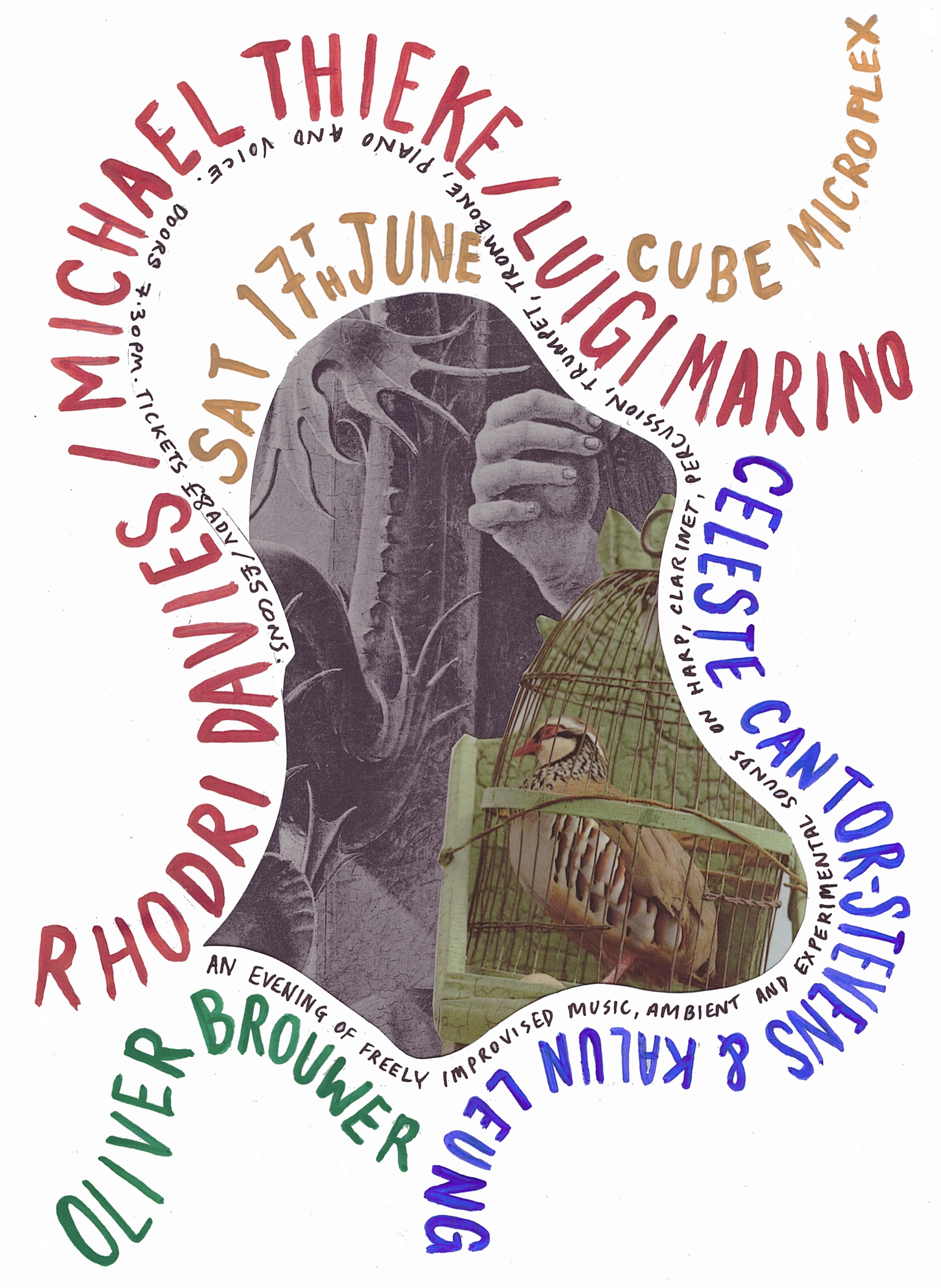 An evening of freely improvised music, ambient and experimental sounds on harp, clarinet, percussion, trumpet, trombone, piano and voice.