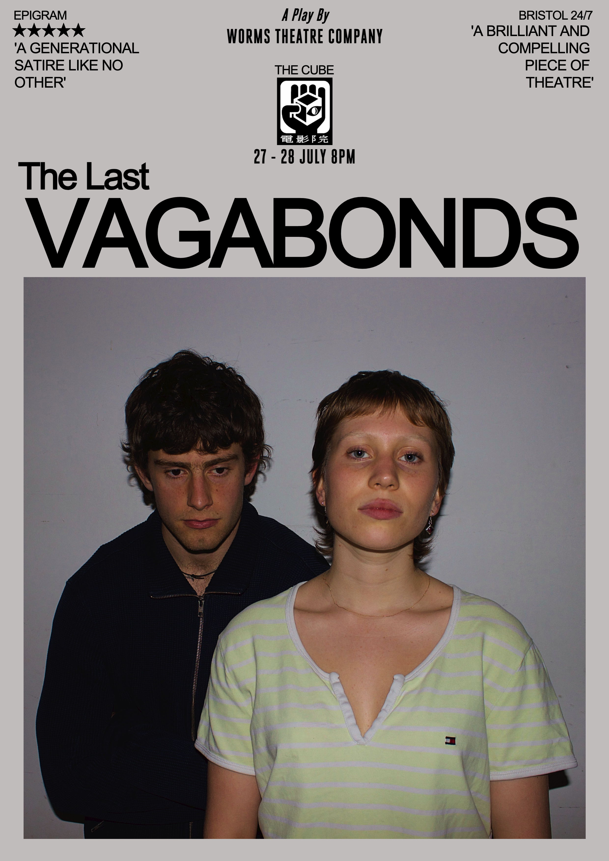 The Last Vagabonds is an original play by Worms Theatre Company. The story explores the life of Western society’s hallowed offspring. Bill, the broken hero. The archetypal alienated student: the incurious, the sexually normative, the financially stingy. The play follows Bill through his meandering middle-class life, until he is confronted by a group of environmental activists. An attraction is awoken in Bill, not out of any moral volition, but from the encounter with an alluring female activist. Bill follows behind in pursuit of affection and purpose. He begins to question the world around him and by extension himself. A dark-comedic satire on the absurdity of apathy in the wake of the climate crisis.