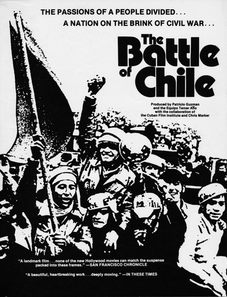THE BATTLE OF CHILE, which chronicles the tumultuous last months of Salvador Allende’s Popular Unity government (1970-1973) in Chile, has been internationally hailed as a powerful historical portrait of the passions of a people divided and a nation on the brink of civil war. The Equipo Tercer Año, the Chilean filmmaking team led by Patricio Guzmán—including cameraman Jorge Müller Silva, chief of production Federico Elton, soundman Bernardo Menz, and assistant director Jose Pino—which photographed and assembled this three-part, four-and-a-half-hour epic documentary, offers the viewer the vivid experience of being thrust into the midst of a society in crisis. The camera is seemingly everywhere, from intense debates in the halls of congress to the smoke and violence of street demonstrations, from the army’s raids on industrial centers for “stockpiled weapons” to mass political rallies in the streets of Santiago, and from the unforgettable sequence in which a newsreel cameraman records his own death by gunfire to the devastating aerial bombardment of the presidential palace.