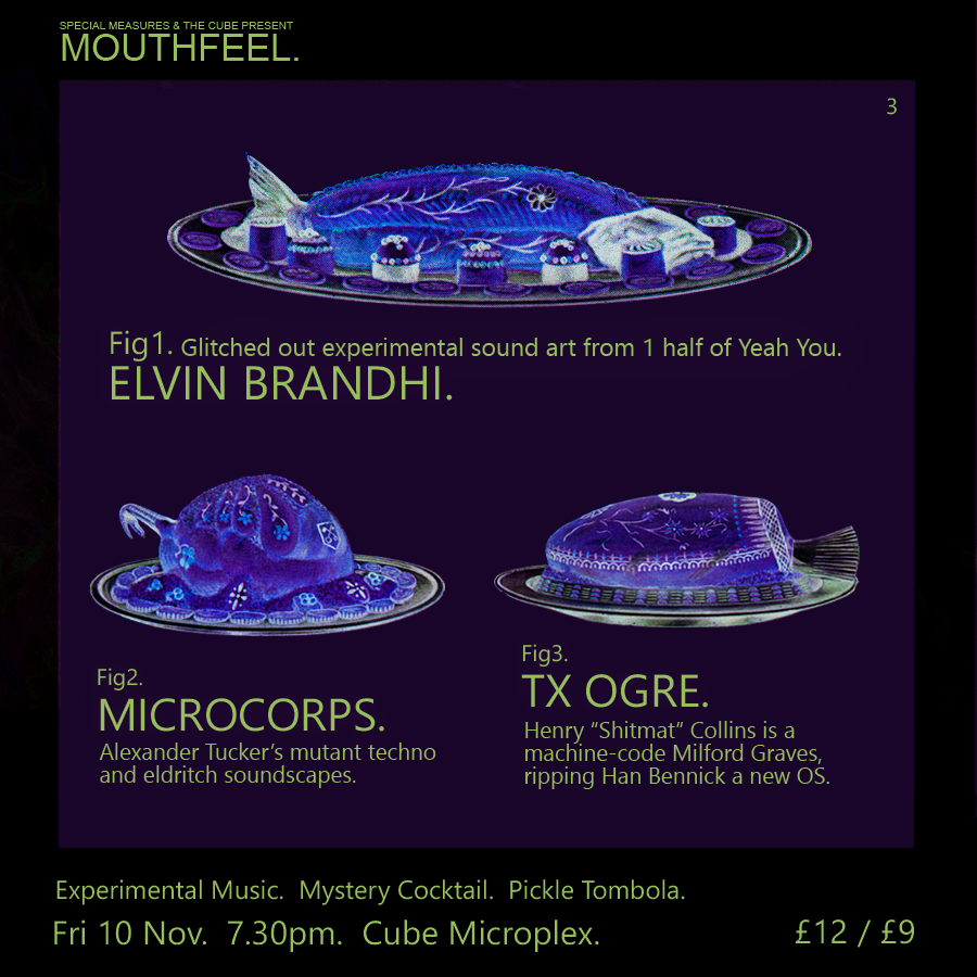 Kickstarting the evening is a set from national treasure, and "people's champion" Henry Collins. Best known for his iconoclastic Shitmat sets, worst known as a crisp podcaster and professional wrestler, tonight he's performing as TX Ogre: a machine-code Milford Graves, ripping Han Bennick a new operating system. Hyper rhythm drum machine free-jazz. Nice.