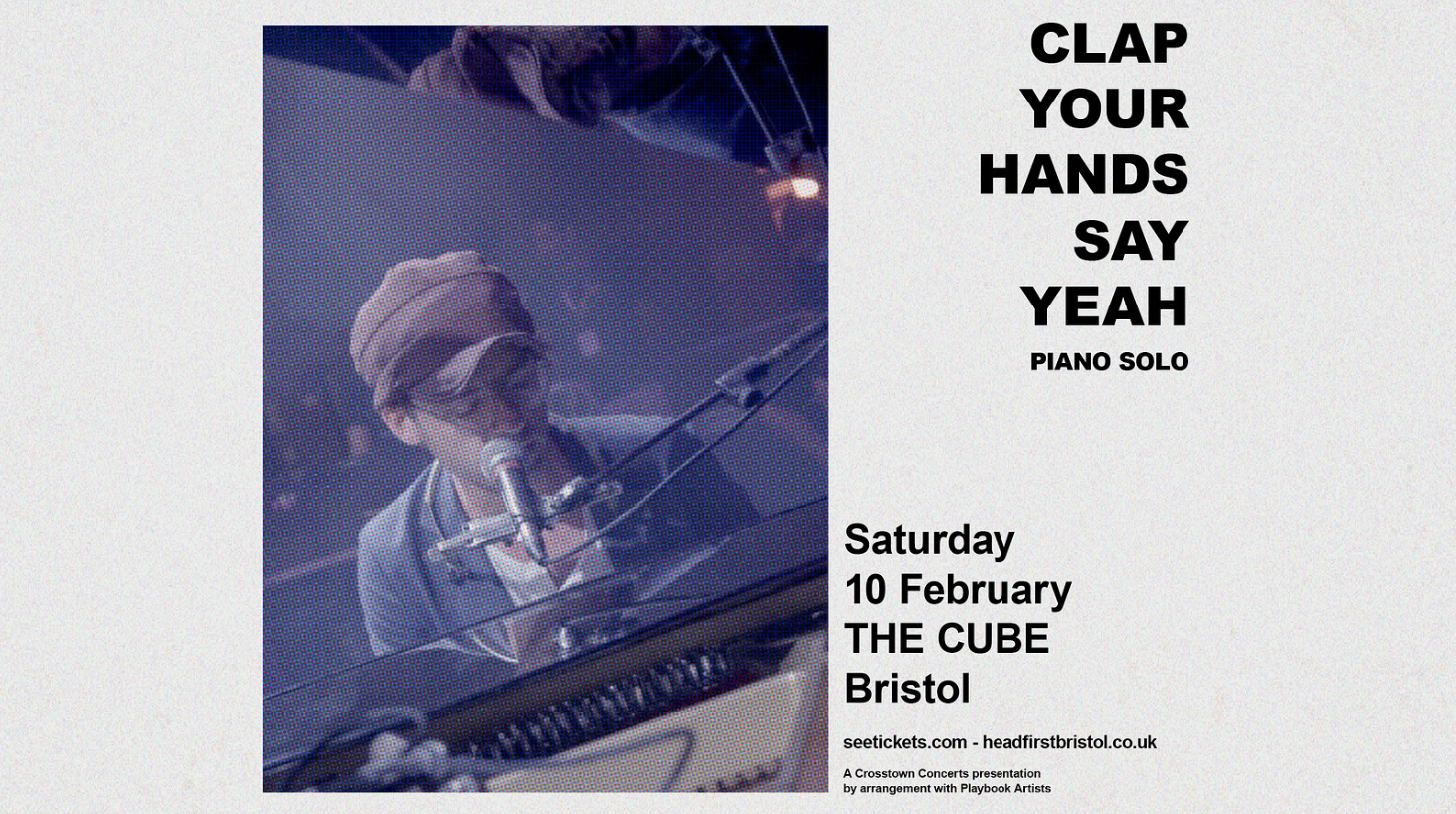 A Piano Performance from Clap Your Hands Say Yeah Doors: 19:30 Curfew: 23:00 Age restrictions: 14+ (U18s must be accompanied by an adult 18+)
