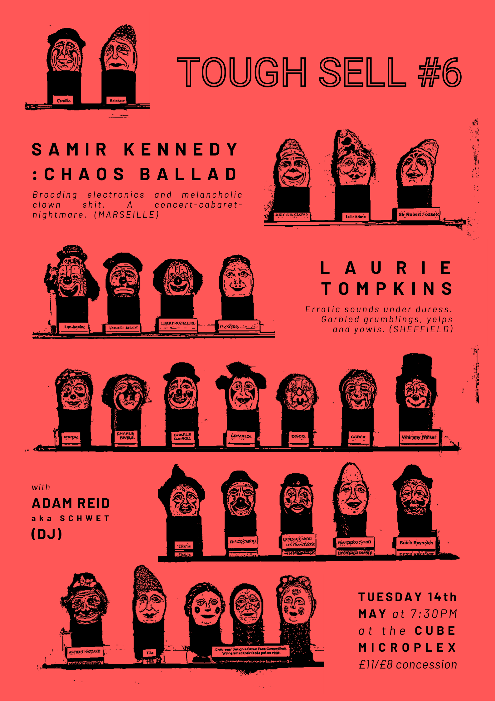 Tough Sell presents a hellish, twisted night of clown shit, including a full-length performance piece from dance and sound artist Samir Kennedy, and a characteristically deranged, spasmodic set from musician Laurie Tompkins. + Adam Reid (Schwet) DJ’ing before, between and after.