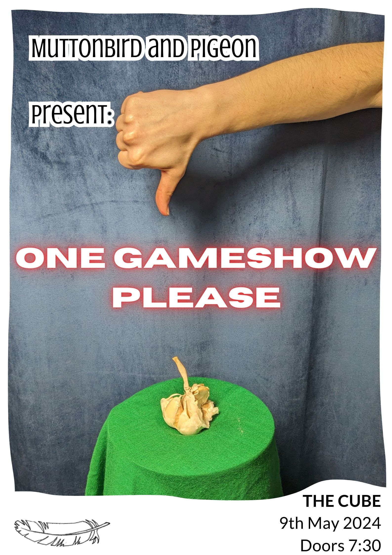 A 50/50 style gameshow where the audience is split in two and compete in nonsensical games, lead by Muttonbird and Pigeon. Expect underwhelming prizes and overwhelming personalities, also a RAFFLE!