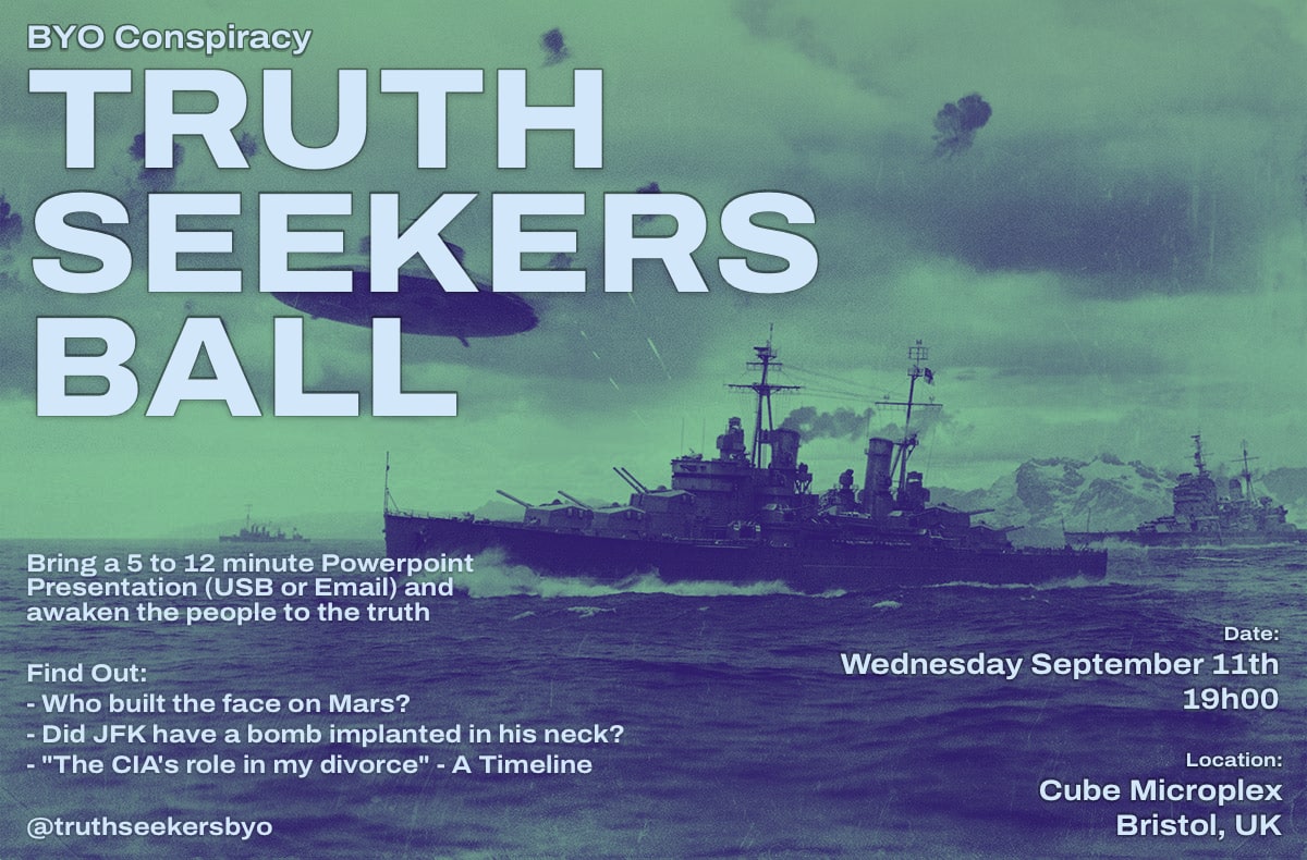 A BYO conspiracy theory event where you present your diligently researched conspiracy theory and we all bring each other closer to the truth