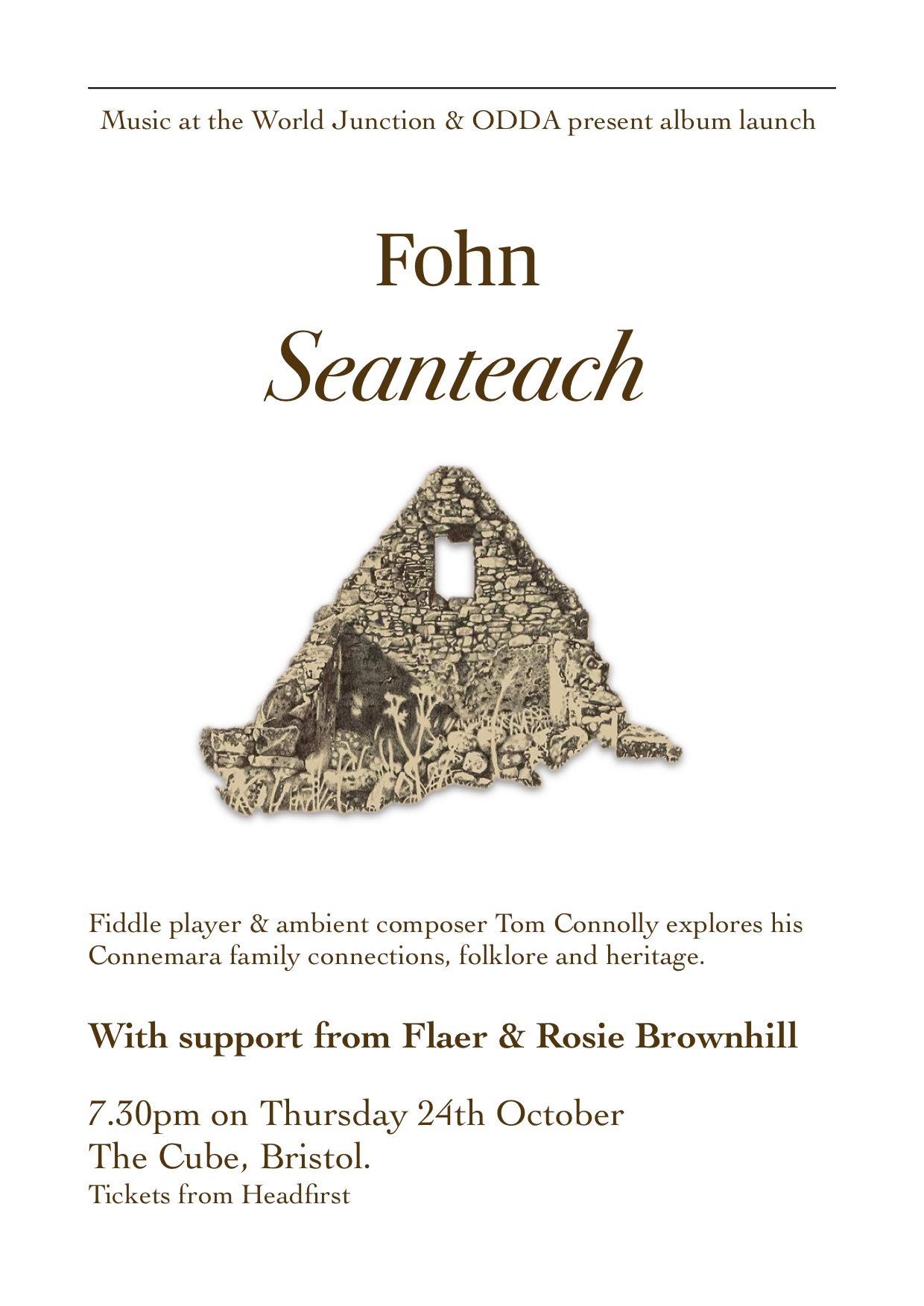 Tom reflects that the compositions often ‘sit at the fraying edges of memories’ informed by generational stories, Irish mythology and coastal life - a liminal space between ‘documentation and fantasy’ amongst the Connemara landscape ‘charcoaled with deserted ruins’. Lamenting, graceful airs portray stories bound with the tensions of sadness, pride & place. New compositions drawing on folklore, the supernatural and Tom’s studies in Anglo- Saxon, Norse & Celtic literature.