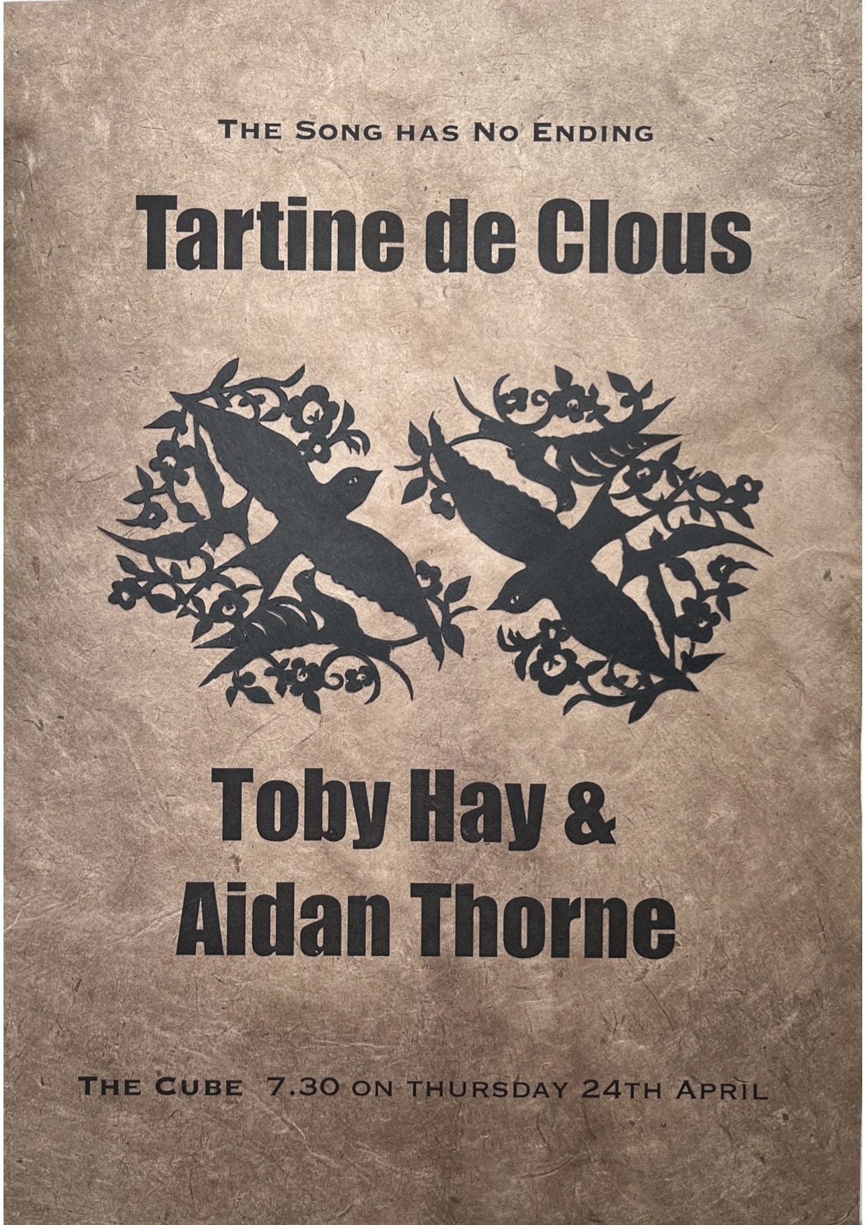 As Chiz Williams, writing on the recording of Au Cube, notes, the songs hold a deeply sensory & transportive power - ‘to taste the stews we ate, the stories we swapped, the technology we manipulated and the people we touched’. In the eloquent simplicity of Alasdair Roberts, the songs of Tartine de Clous are ‘songs passed down and sung by ordinary men and women, gracefully delivered with the poetic economy which unites the folk song of all peoples’. Stories told through a song that contains no ending.