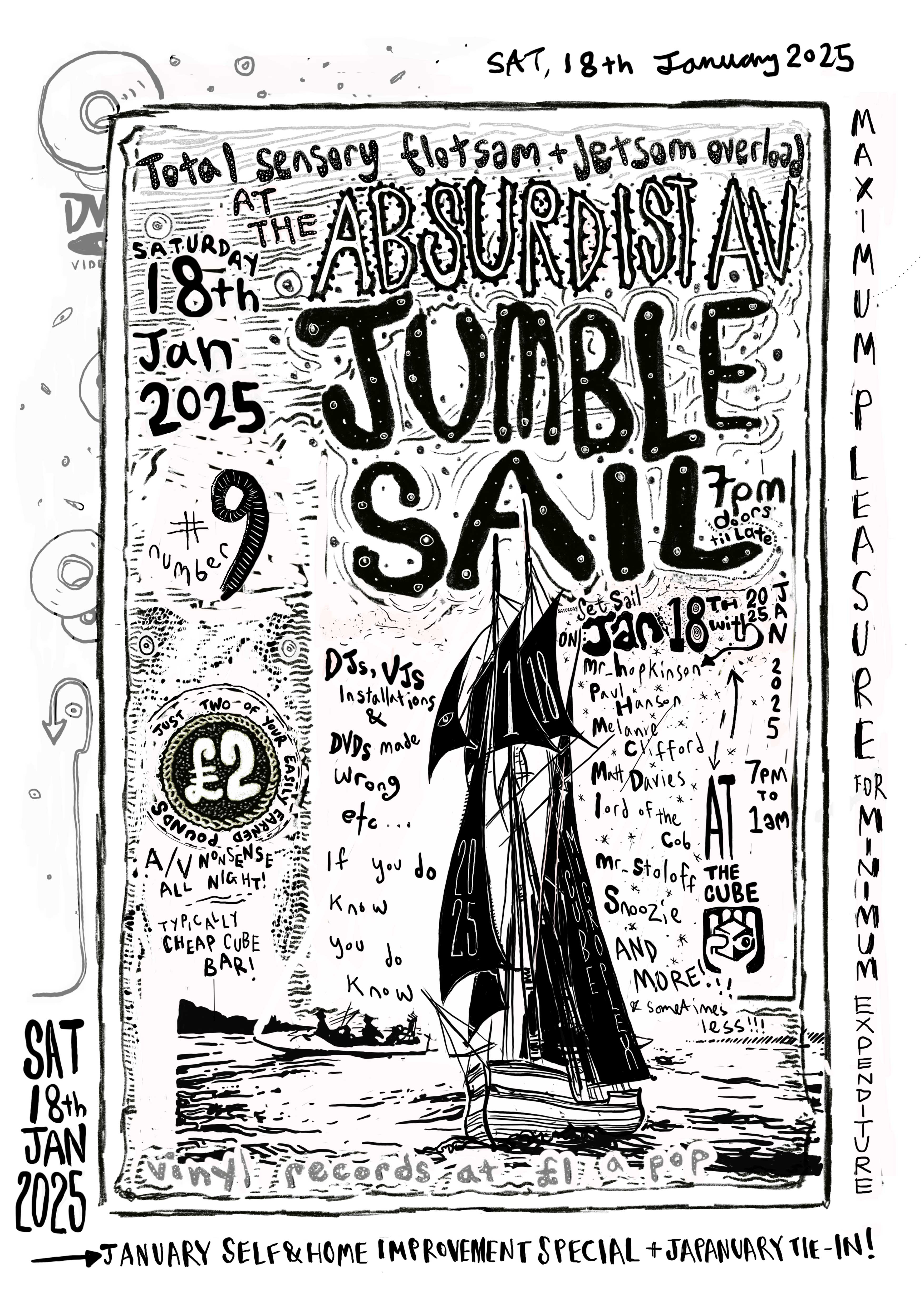 Come stowaway on a strange trip through physical media’s flotsam & jetsam, mixed & re-fixed live on ancient VJ equipment in the cinema with full use of the cinema surround sound, with happenings and installations in the other Cube spaces.