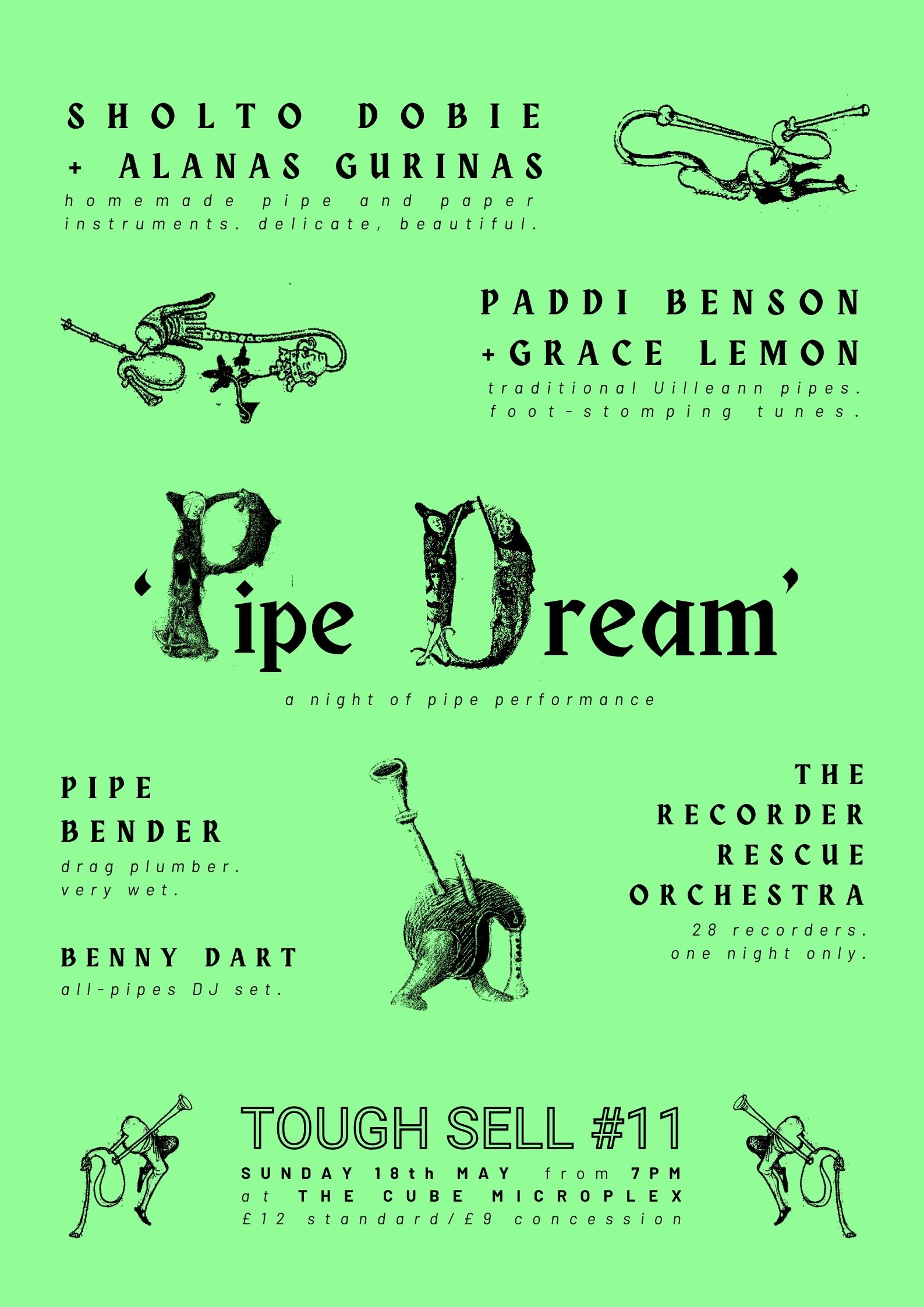 There'll be foot-stomping tunes on the Uilleann pipes from folk musicians par excellence Paddi Benson and Grace Lemon. You'll have to pipe down to appreciate Sholto Dobie and Alanas Gurinas's exquisite, delicate experimentation via self-built tubes, valves, and vibrating paper. Bristol's premier plumbing-themed drag king Pipe Bender will be laying pipe (for real, features actual plumbing). And a one-night-only gathering of players form a drone orchestra of 28 recorders reclaimed from a local school. Plus Benny Dart piping out pipe records in the bar all night long.