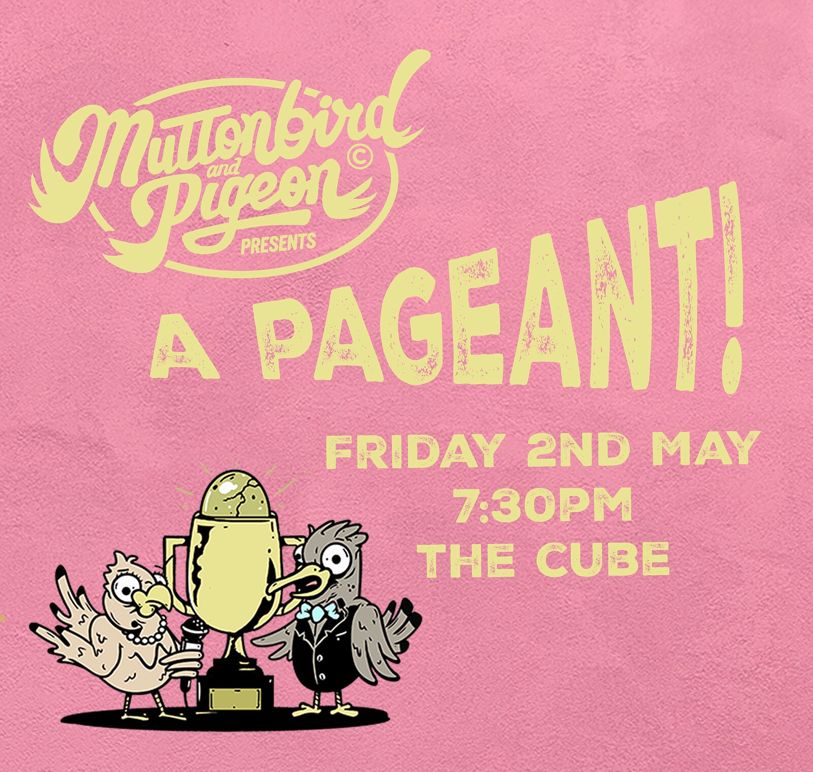 Muttonbird and Pigeon (Bristol's PREMIUM entertainment dream team) bring A PAGEANT to Bristol! Beauty is optional, if anything it's discouraged! Who could compete with Pigeon Tits anyway?