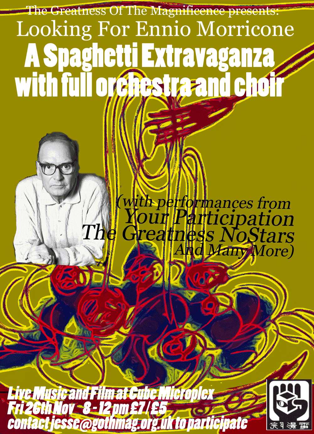 The greatness of the magnificence is back again this month presenting the music of Ennio Morricone. Some of Bristol's finest musicians will be presenting their versions of some of Morricone's best and least known themes and songs. As usual the general public and their friends are invited to participate in this event. All enquiries to jesse@gothmag.org.uk.