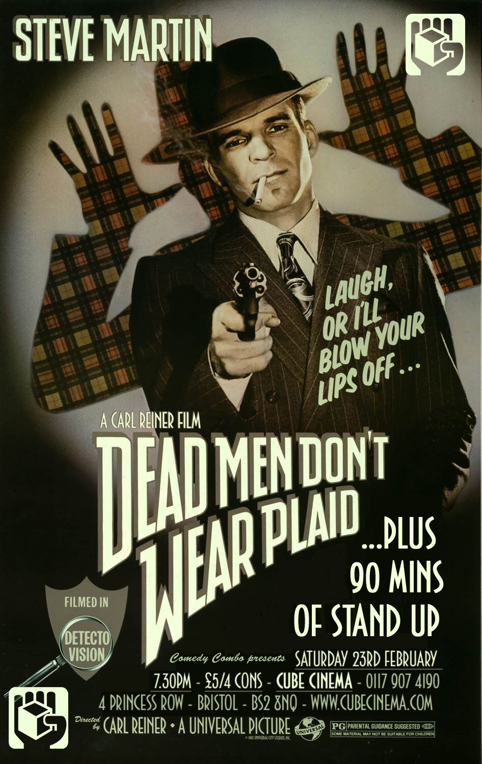After an hour plus of quality stand up, we are showing "Dead Men don't Wear Plaid". Both a spoof of, and an homage to 1940s/50s Hollywood film noir, clips from classic films are seamlessly incorporated to allow Steve Martin, as private eye Rigby Reardon,to appear on screen with luminaries including Humphrey Bogart, Burt Lancaster, James Cagney and Kirk Douglas. The dames include Bette Davis, Veronica Lake and Lana Turner.