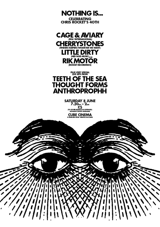 The night is a celebratory gathering for Chris from Rocket Recordings 40th, and apart from 'Nothing is...' in the bar there are some very special live acts performing in the cinema itself.