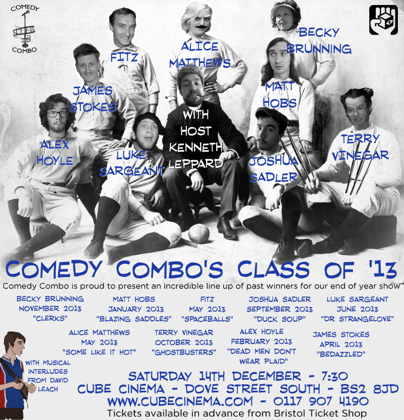 Comedy Combo's Class of '13 welcomes back all nine audience-chosen winners from each of our past events this year. Matt Hobs, Alex Hoyle, Daniel FitzHenry, James Stokes, Alice Matthews, Luke Sargeant, Terry Vinegar, Joshua Sadler and Becky Brunning. Hosted by Kenneth Leppard with musical interludes from David Leach.