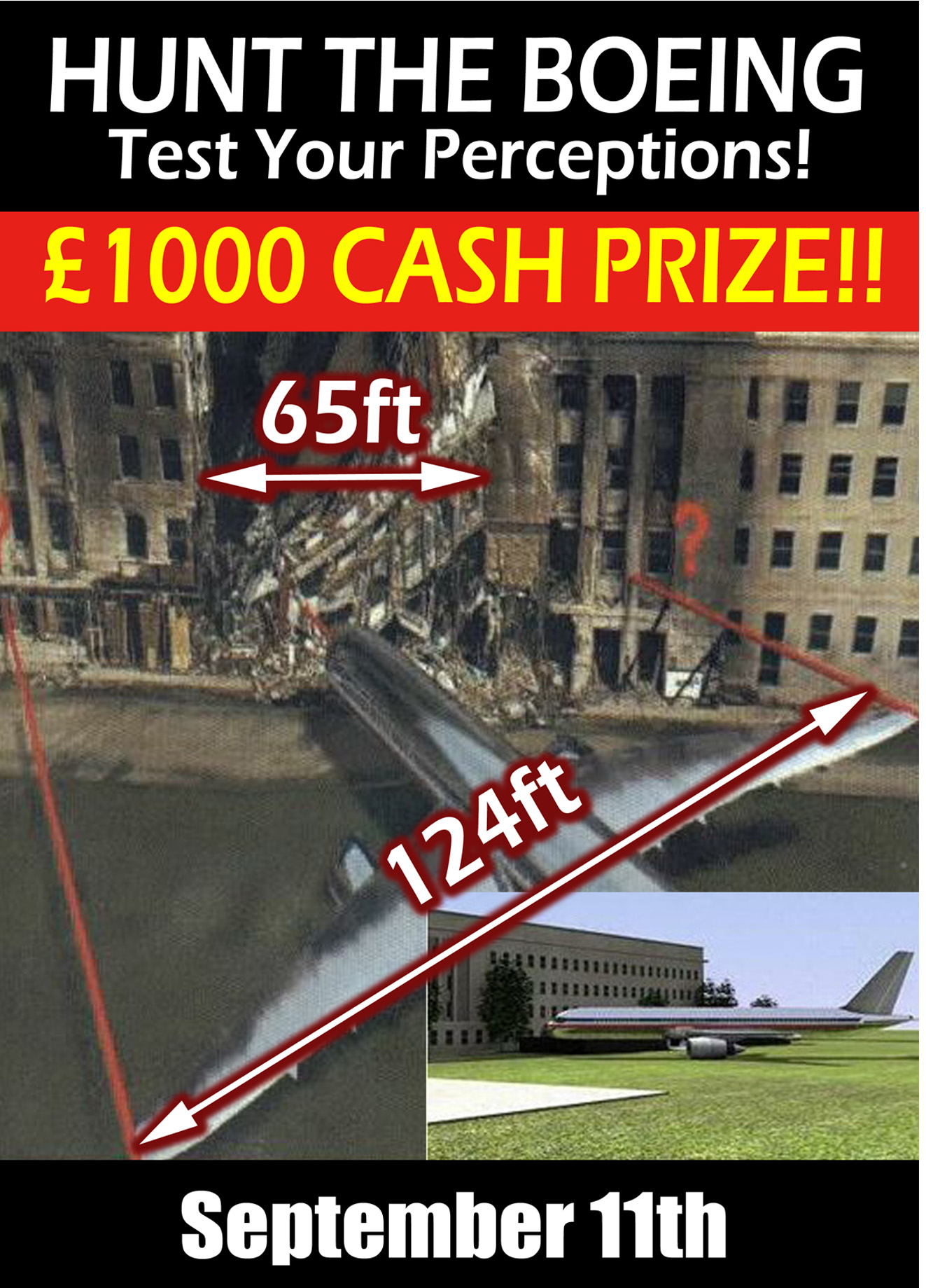 An evening of CONSPIRACY FACTS NOT THEORIES. An enquiry and analysis into the official 911 story. This event will show well documented visual evidence with an opportunity for Q&A open debate, plus a chance to win £1000 CASH in the HUNT THE BOEING competition (see flyer for details). The truth will set you free.