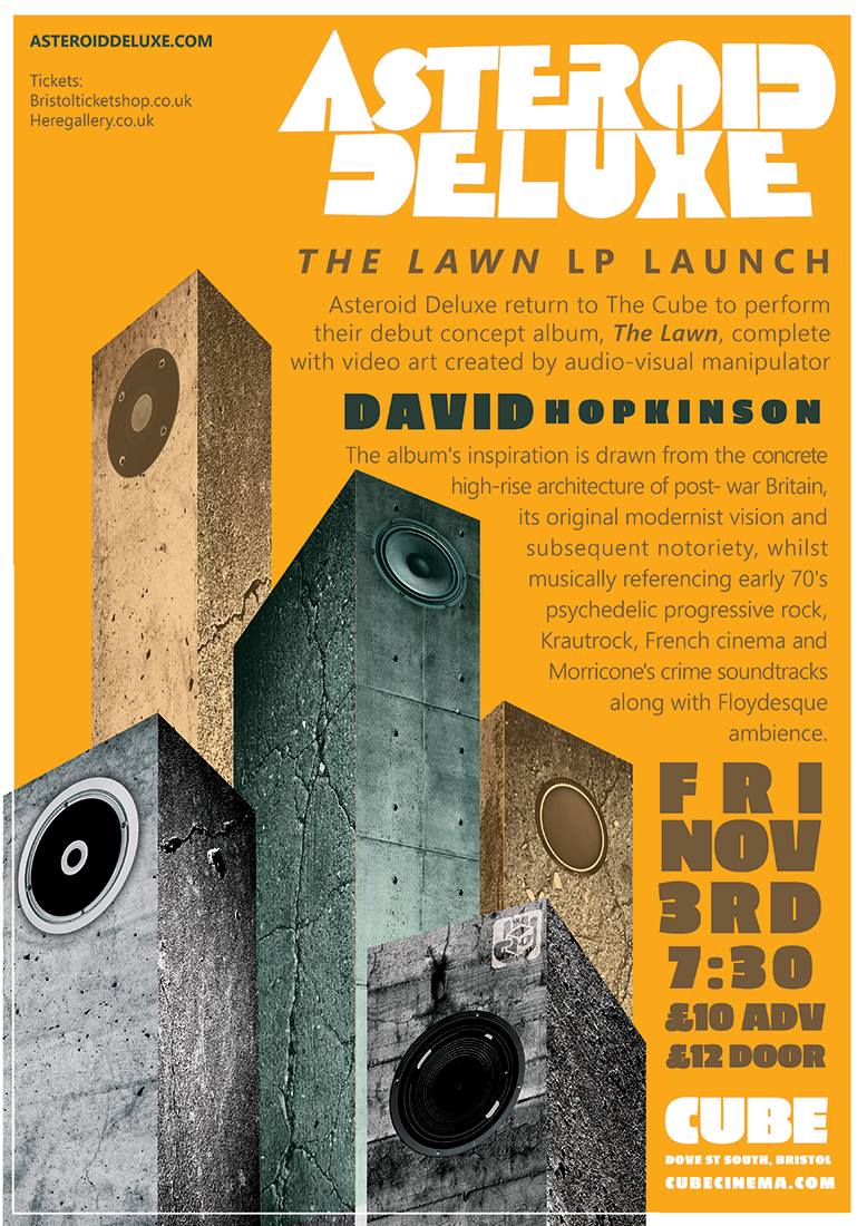 Following their acclaimed performances re-scoring cult 70's films The Holy Mountain and La Planete Sauvage and their appearance at Green Man 2017, Asteroid Deluxe return to The Cube to perform their début concept album, The Lawn, complete with video art created by audio-visual manipulator David Hopkinson.